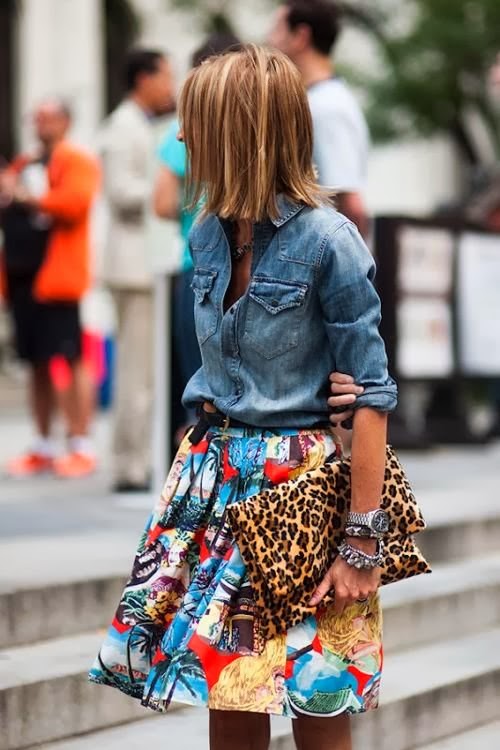 Feeling bold? Pair your denim shirt with a feathered skirt, and throw on a vintage-style sweatshirt.
